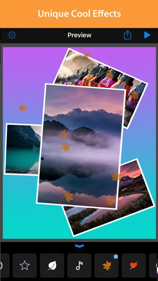 With the unique Effect function, you can easily add a lot of cool effects to your collage such as snow, bubbles, fallen leafs ..., which makes your collage beautiful and unique.