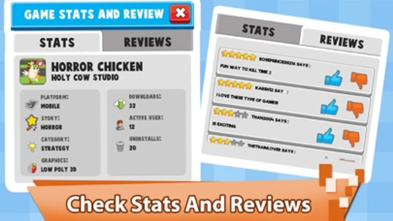 As a creator, you must check ratings and reviews of your games created on PC / Computer, Console, Mobile. Also check statistics such as number of installs and uninstalls of your games and become the best video game creator and a leader of games industry.