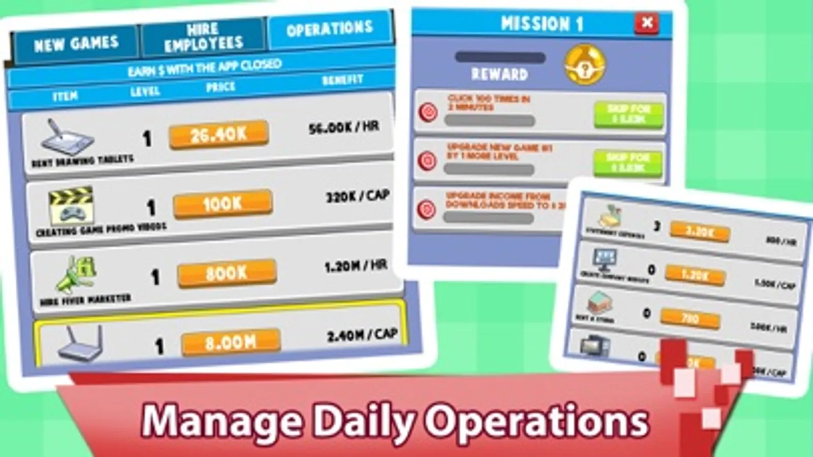 Get idle cash, even when you are offline. As a creator of games you have to buy PCs / Computers, consoles, laptops, mobiles for testing games, get internet etc. Get whatever it takes to keep the company going and earn benefits in the form of passive income.