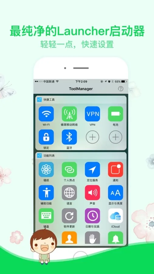 ToolManager能够帮您在通知中心中,快速启动设置中的任何功能,极大的简化了您iPhone和iPad的使用。体积小巧。节省了您手机的空间。我们专注于功能纯净。