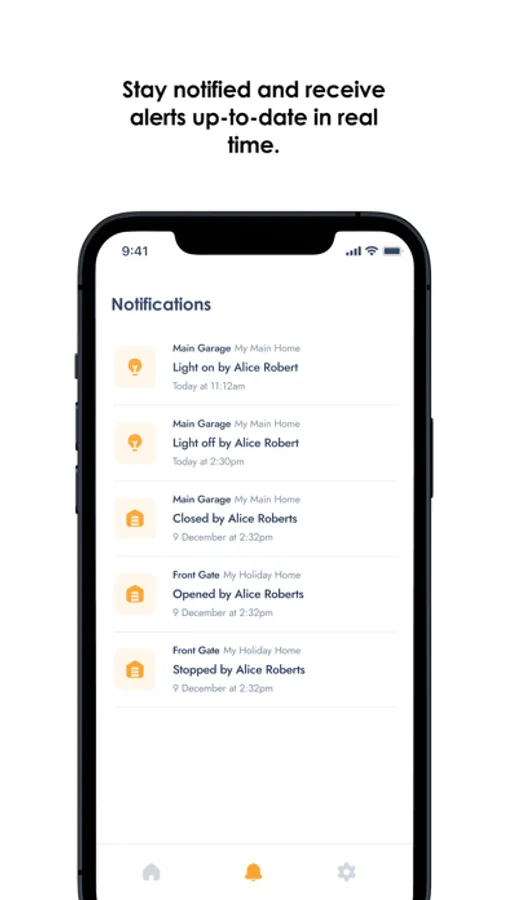 • Real-time alerts - Push notifications send alerts whenever your garage door or gate is operated, opened for an extended period or when your opener requires a service.