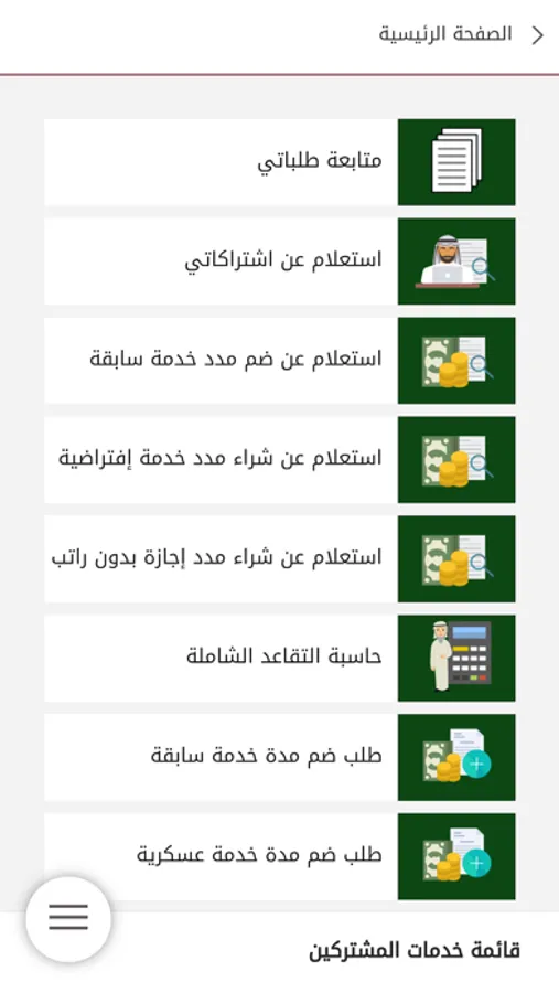 يتضمن تطبيق التقاعد على الجوال الخاص بالهيئة قائمة من الخدمات والميزات المصممة بأحدث المعايير لدعم عملاء الهيئة (مشترك، متقاعد، مستحق، وكيل، عامة الجمهور) بتمكينهم من تقديم ومتابعة طلباتهم، الاستعلام عن بيناتهم، والإجابة على استفساراتهم الخاصة باحتساب مستحقاتهم التقاعدية.