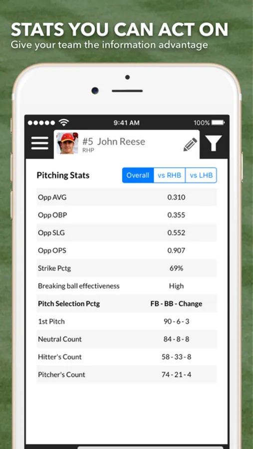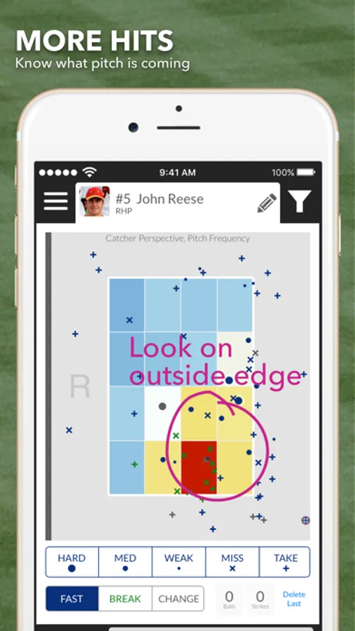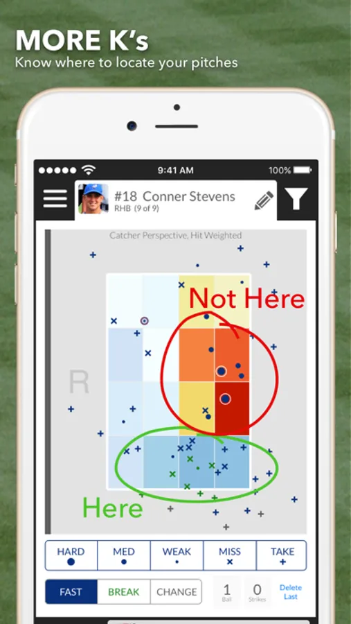 The app is equally helpful If you’re the hitting team. You're batters want to know what pitch is coming next. The same pitch data looked at from the perspective of the pitcher instead of the hitter gives us a heat map that will tell you where the pitcher throws the ball most frequently. You can even see this information for different counts so your batters will know what pitch is most likely to come. The app also tells you what type of pitch -- fastball, breaking ball, or change up -- they're most likely to get for each count. By giving your batters this information you’re setting them up to succeed.