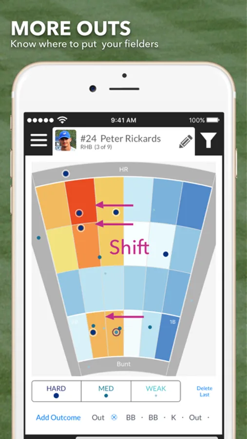 3 Up 3 Down is not designed for scoring a baseball game. There are other apps that do that very well. Instead, 3 Up 3 Down is focused on tracking the information you need to make game-time decisions that will lead to more wins. Here’s how it works. As you watch the game you track each pitch, hit and outcome. As you collect pitch data a heat map is generated which shows the parts of the zone where the batter hits the ball hard and the parts where they don’t. The app also tells you how aggressive the batter is and how well they hit breaking balls. All this information helps you figure out the right pitch sequence to get the batter out. With the hit data you collect you'll see precisely where the batter tends to hit the ball so you can adjust your fielders to give them the best chance of making the big catch.
