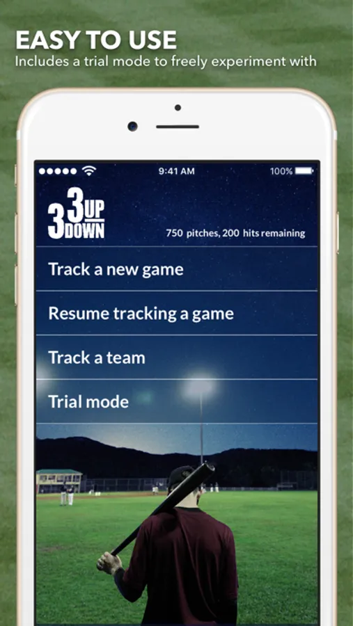 If you want to play around with the app to get a feel for how it works there's a trial mode with pre-populated teams and data. Any pitches and hits you add in the trial mode don't count against your allotment.