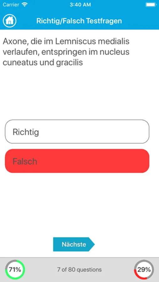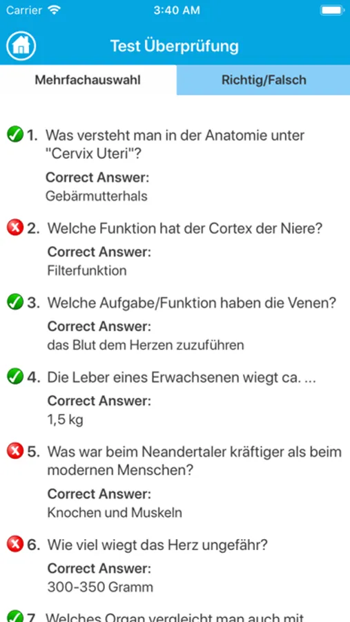 - Es gibt 2 Quiz-Modus. Multiple-Choice Quiz and Richtig/Falsch Quiz.