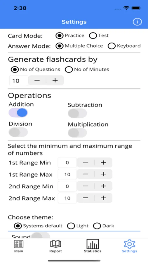 * Cards Mode: Practice/Test.