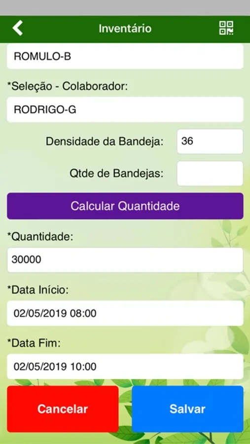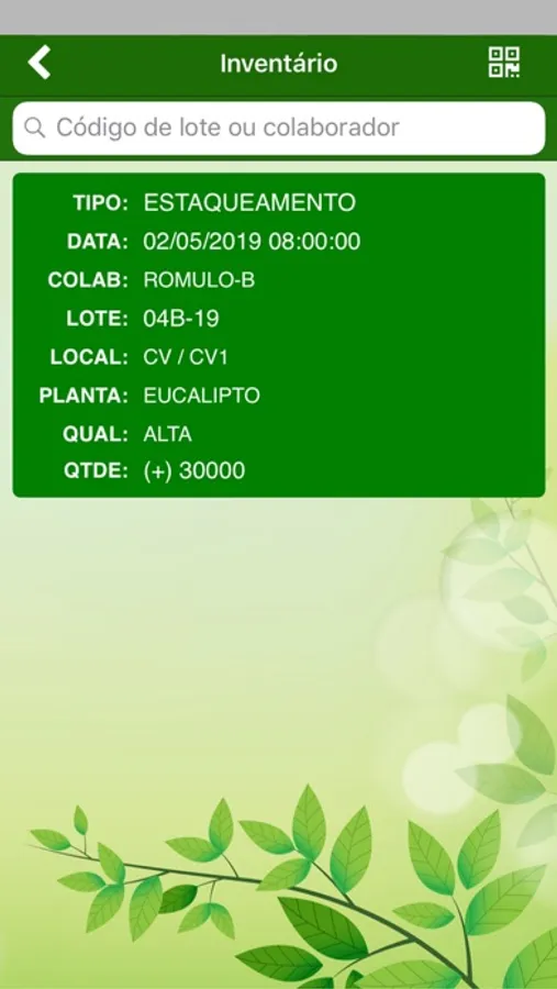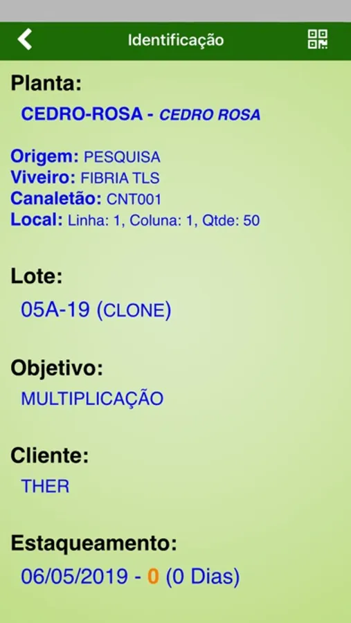 - Lê códigos QR das etiquetas de Identificação para Inventário (Tubetes, Bandejas, Mesas, Estufas), Identificação de Quadra (Quadra inteira ou fileiras/áreas de armazenamento, crescimento, rustificação ou expedição) e Identificação de Ponto Inicial de Monitoramento de Campo (Para uso em placas de identificação de ponto inicial de monitoramento de experimento, talhão, tratamento ou repetição);
