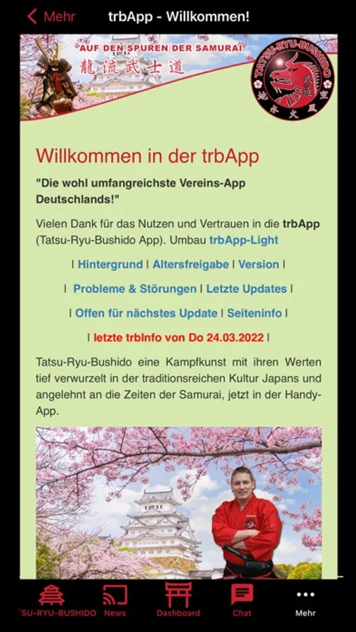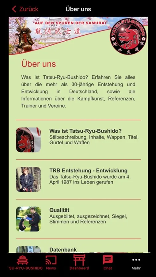 Tatsu-Ryu-Bushido eine Kampfkunst mit ihren Werten tief verwurzelt in der traditionsreichen Kultur Japans und angelehnt an die Zeiten der Samurai. Diese App ist ein MUSS für Mitglieder und ein SOLL für alle Kampfkunst, - Sport- und Kulturinteressierte.