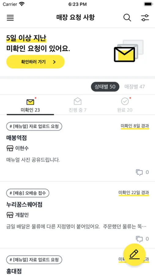 - 가맹점 요청 사항을 App에서 카테고리 별로 담당자가 손쉽게 확인