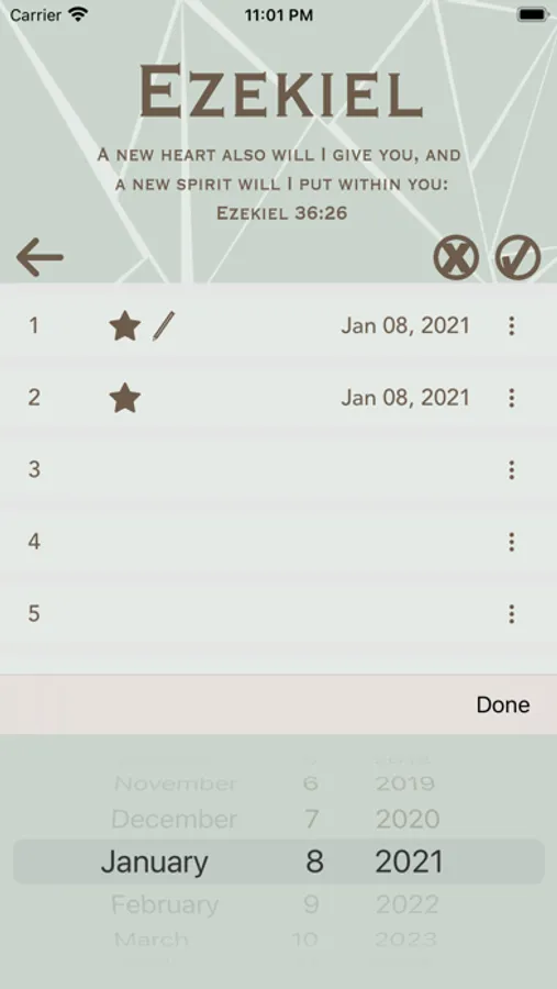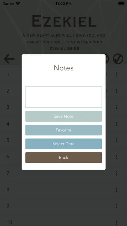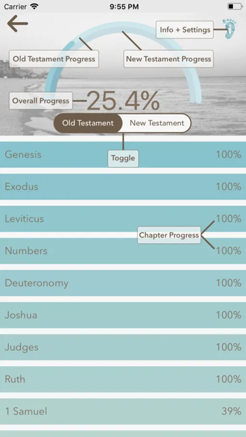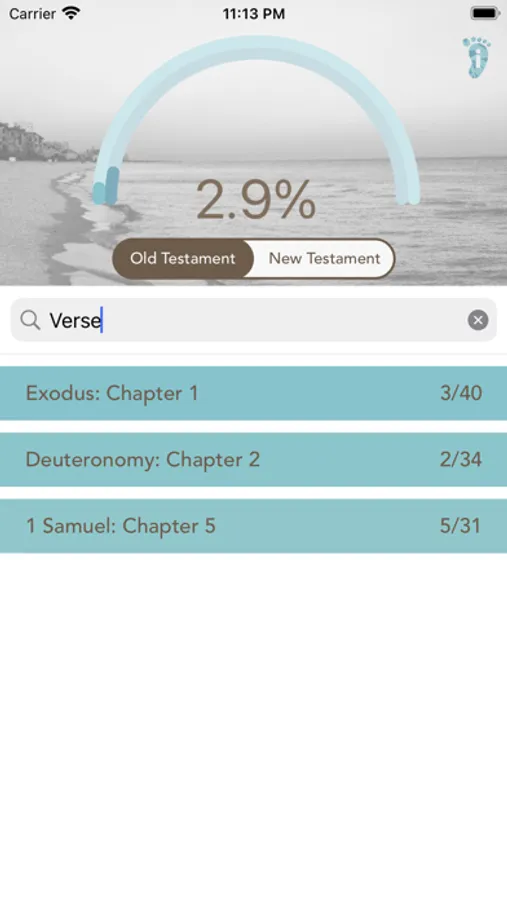 Relax, let Footsteps track your journey through the Bible. Simply click on a completed chapter and Footsteps will catalog your advancement. View your progression in the percentage bar. May Footsteps guide you closer to Him.