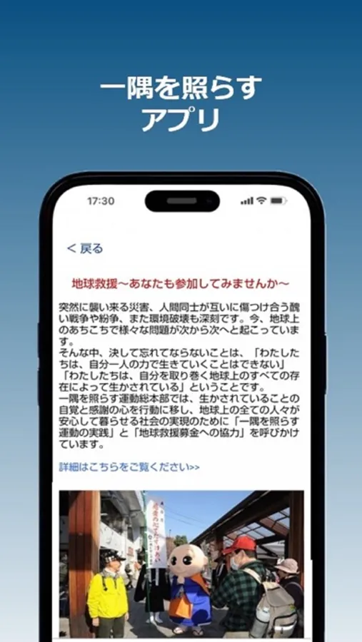「一隅を照らす運動」は、「一隅を照らす、これすなわち国宝なり」という伝教大師最澄 さまのご精神を現代に生かし、信仰と実践によって一人ひとりが心豊かな人間になり、 平和で明るい世の中を共に築いていこうという社会啓発運動です。
