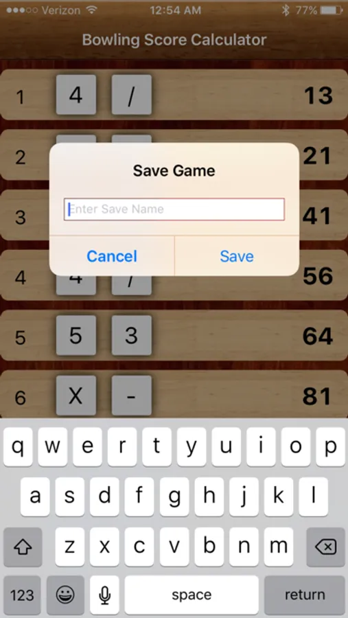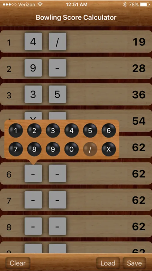 Bowling Calculator's simplistic interface allows for quick entry of your scores. Simply tap a frame, and select the score in the pop-up. Your total score is calculated on-the-fly with each entry.