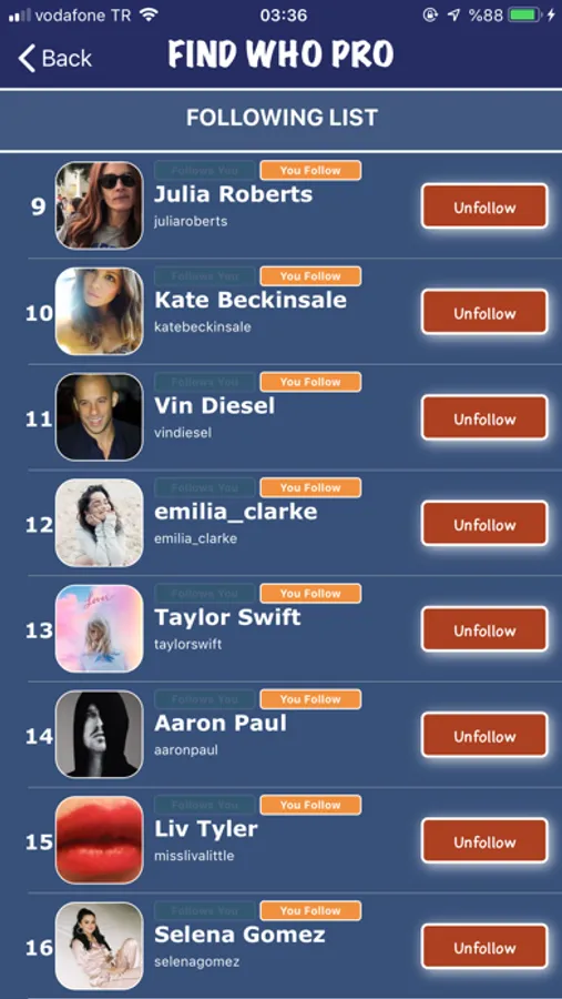 FindWhoPro Unfollowers list shows you the users which you followed but not followed back. You can unfollow any of your unfollower with one tap.