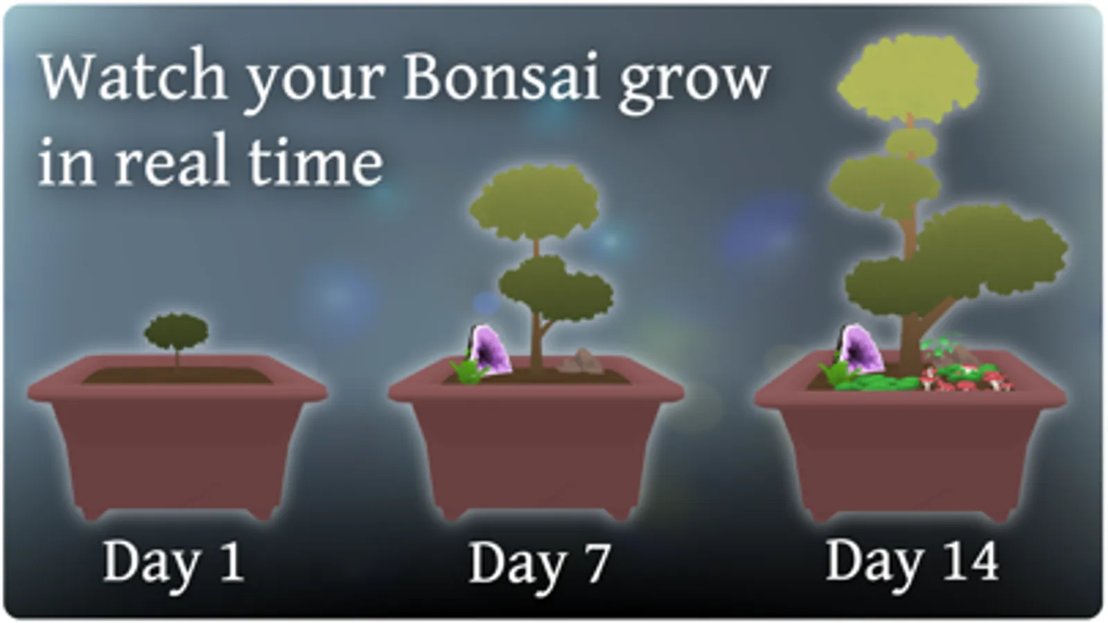 - Shape your bonsai over time by adjusting the direction arrows attached to each branch, then return later to see how it has grown.