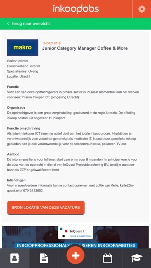 De InkoopJobs app is ontwikkeld voor de inkoopprofessional van vandaag om direct via de mobiele telefoon of tablet op de hoogte te blijven van alle inkoop gerelateerde content in de markt voor handen. Via de InkoopJobs app krijgt de inkoopprofessional direct een actueel inzicht in alle vacante en nieuwe inkoopvacatures, interim opdrachten, nieuwsitems, opleidingen en evenementen voor handen. Deze app is De ‘must have’ voor iedere inkoopprofessional die wil bouwen aan zijn of haar carrière of deze in een stroomversnelling wil brengen. Via directe push-berichtgeving naar het mobiele scherm van de gebruiker wordt deze op een proactieve wijze op de hoogte gebracht van alle specifieke items waar hij of zij interesse in heeft. Zo wordt er niets aan het toeval overgelaten en is de volgende stap in zijn of haar inkoopcarrière enkel nog maar een formaliteit.