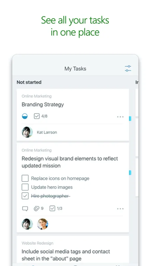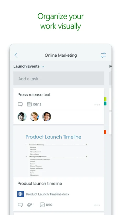 Each plan has its own board, where you can organize tasks into buckets. You can categorize tasks based on their status or on whom they’re assigned to. To update the status or change assignments, just drag and drop tasks between columns.