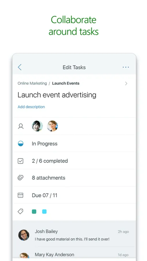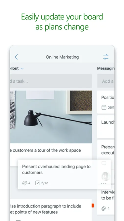 Planner works across all your devices. And with Planner, everyone is always on the same page. Continue conversations and updates tasks while on-the-go or at your desk.