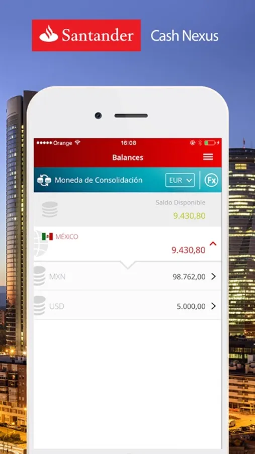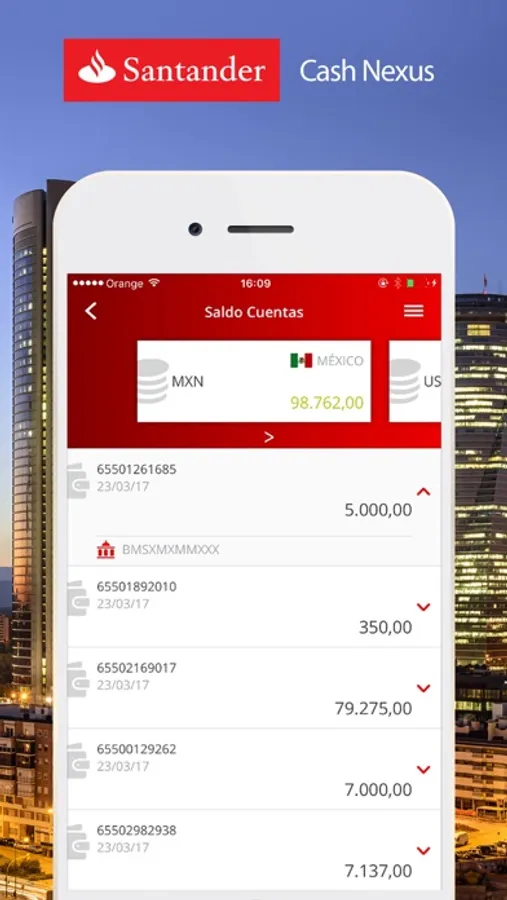 The application is an extension of the Santander Cash Nexus Portal in wich you can access your end of day account balances using the same user credentials as for the Portal.