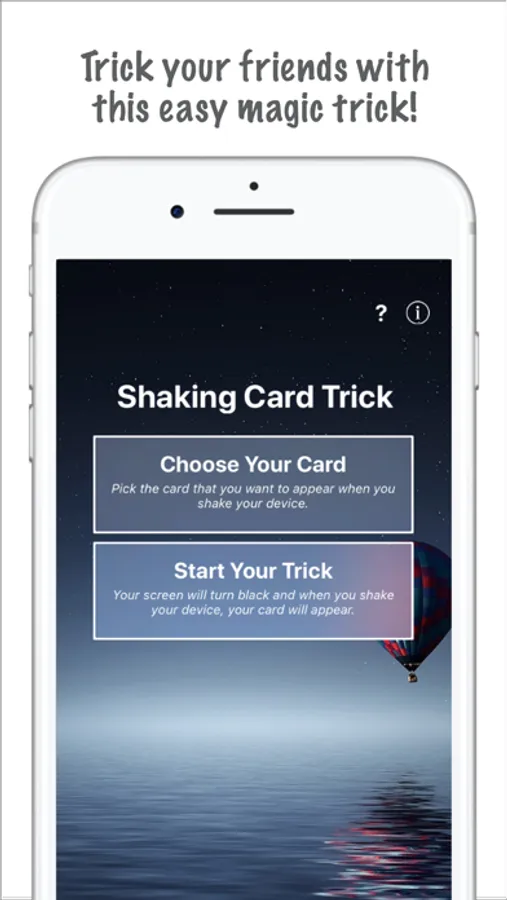 Easily perform many magic tricks by simply shaking your device. Before the magic trick begins, just pick any card in the deck and press start! The device will pretend to shut off, and when you shake the device, the card will appear.