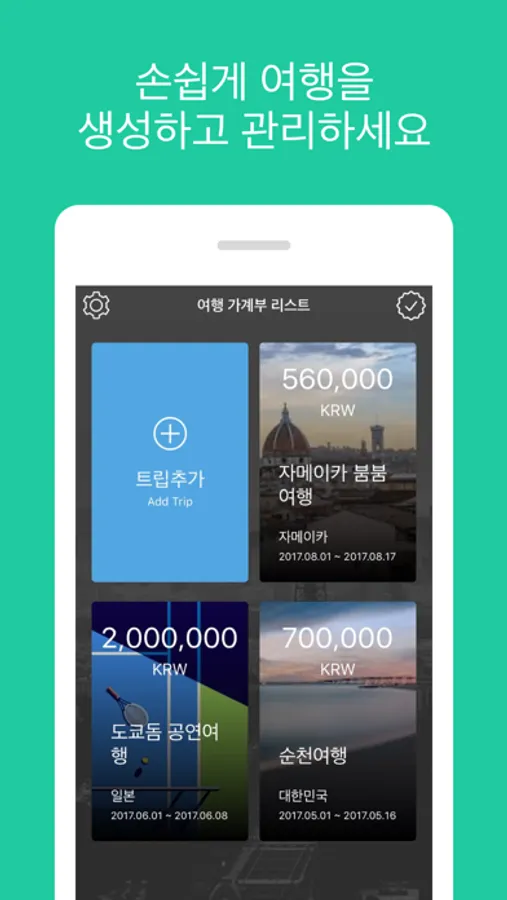 여행 트립별 기록을 아름 다운 책자 형식처럼 작성하고 관리할 수 있습니다. 일반적인 가계부와 다르게 여행의 고수 가계부의 경우는 트립별 나라와 기록을 히스토리 방식으로 제공해서 사용자가 알아보기 쉽고 멋있는 나만의 여행 일기와 같이 완성하도록 되어있습니다.