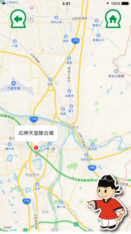 また藤井寺市の公式キャラクターのまなりくんが、目的地の方角を教えてくれるナビゲーション機能や、主要古墳の解説板のマーカーを読むことで表示されるAR解説なども楽しむことが出来ます。