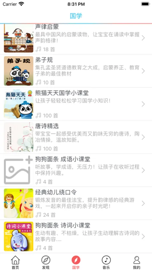 唐诗300首:国学经典, 十万个为什么, 经典儿歌, 贝瓦儿歌, 儿歌多多, 胎教盒子, 宝宝树, 辣妈帮, 育儿宝典, 宋词, 元曲, 宝巴士大全, 智慧幼教, 学霸君, 启蒙教材, 儿童道德丛书, 早教图书, 汉子王国, 魔力小孩, 熊猫博士, 学习