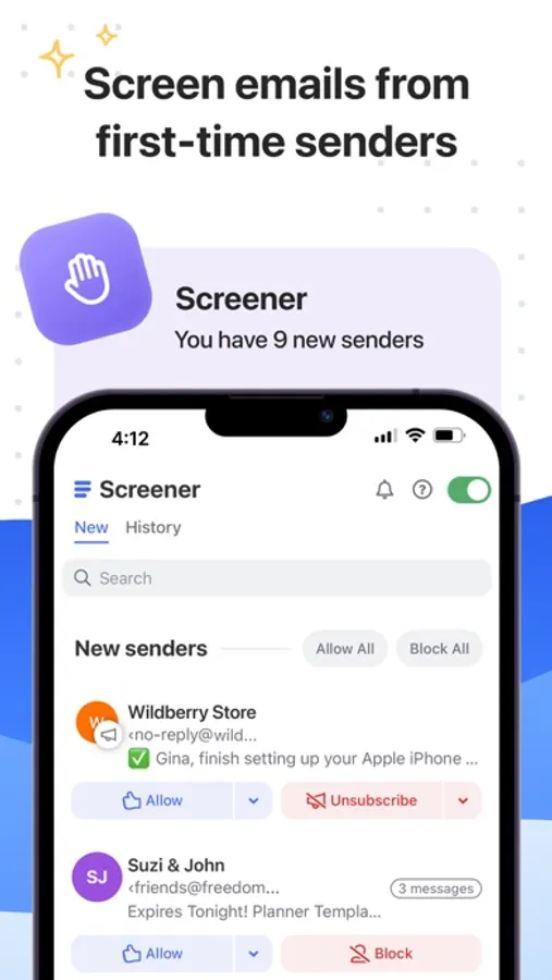 • Screen emails like phone calls. Choose whether to receive messages from new senders.