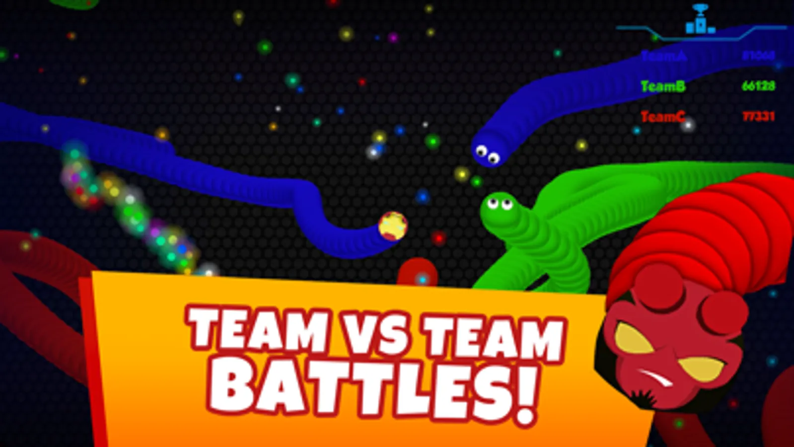Ally with other snakes in the zone to play against other teams! Enjoy the fun 2-team-battles and challenging 3-team battles. Use advanced tactics and catch other worms into your traps.