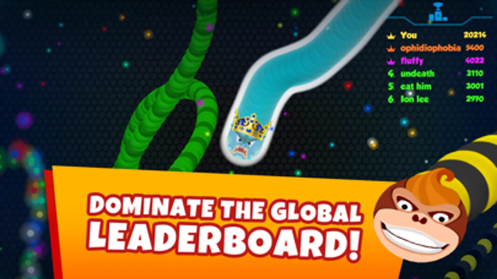 How long can you stay alive in the epic battle of snakes? Enter an enormous arena full of players all around the world! Grow fast, climb to the leaderboard's top, and win a Snake King title!