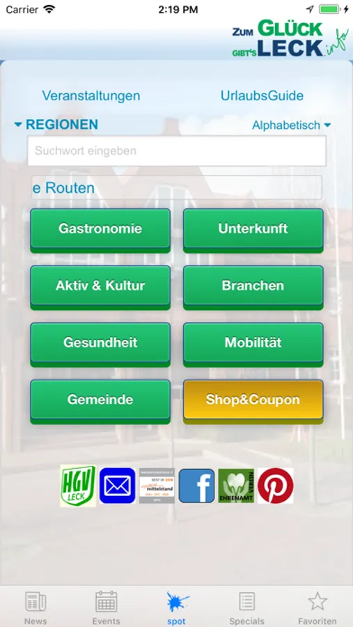 Diese kostenlose App aus Leck und Umgebung ist der nützliche Begleiter für die Planung, Buchung und Durchführung ihrer Reise. Mit Hilfe einer Volltextsuche, eines Kalenders oder verschiedener Suchen nach Kategorien und Merkmalen können die Informationen selektiert werden die den Bedürfnissen und Bedarfen am besten entsprechen. Die Zusammenstellung von Favoriten als Urlaubsplaner stellt die Interessen übersichtlich zusammen. Neben der alphabetischen Darstellung ist auch die Darstellung nach Entfernung oder auf einer Karte möglich. Neben einer kurzen Info zum Objekt (Restaurant, Sehenswürdigkeit, Hotel, u.v.a.m.) stehen auch alle Kontaktmöglichkeiten, Alternativen zur Suche und gegebenenfalls Bewertungen zur Verfügung.