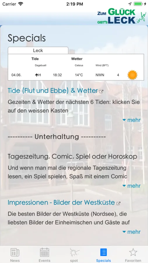 • ständig aktualisierte Informationen zu Wasser (Tiden) und Wissenswertem