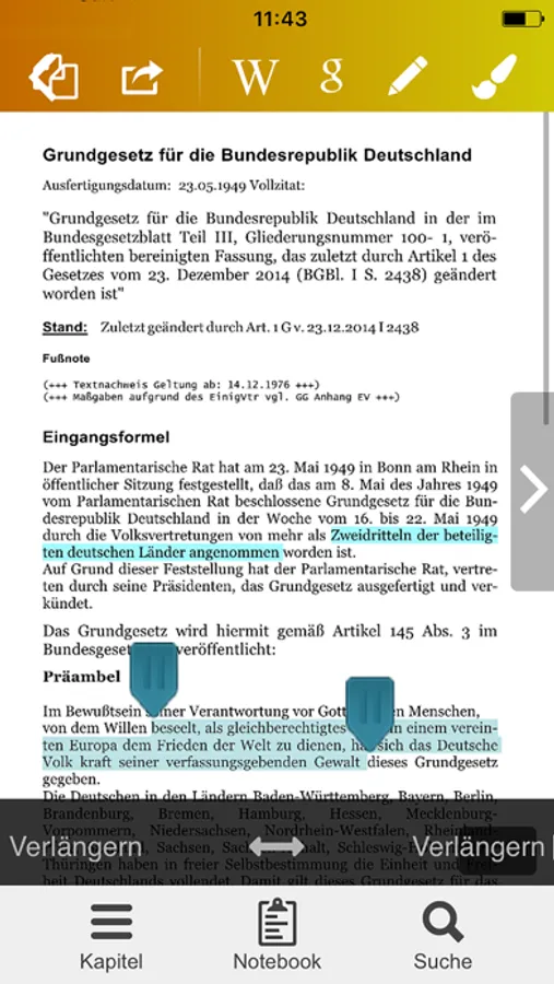 Die Suchfunktion ermöglicht es, beispielsweise das GG direkt nach Stichworten zu durchsuchen. Mit einem einfachen Doppelklick können sie ausgewählte Wörter direkt auf Google nachschlagen. Über die Menüleiste im unteren Bildrand können gezielt Notizen zu einzelnen Artikeln erstellt werden. Des weiteren verfügt die Applikation über die Funktion Textstellen zu markieren und Buchzeichen zu setzen.