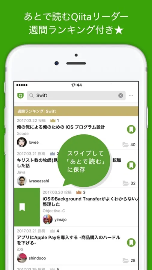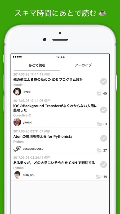 「あとで読む記事」は一覧で表示され、スキマ時間に読むことができます。読んだ記事のアーカイブもスワイプ操作で簡単。