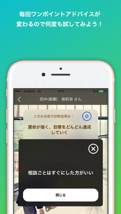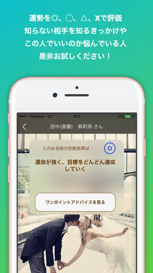 - 結婚相手としてこの人でいいのか迷っていた時にこのアプリで姓名判断をして自分に納得がいく理由のひとつになりました!