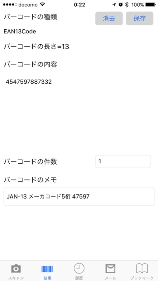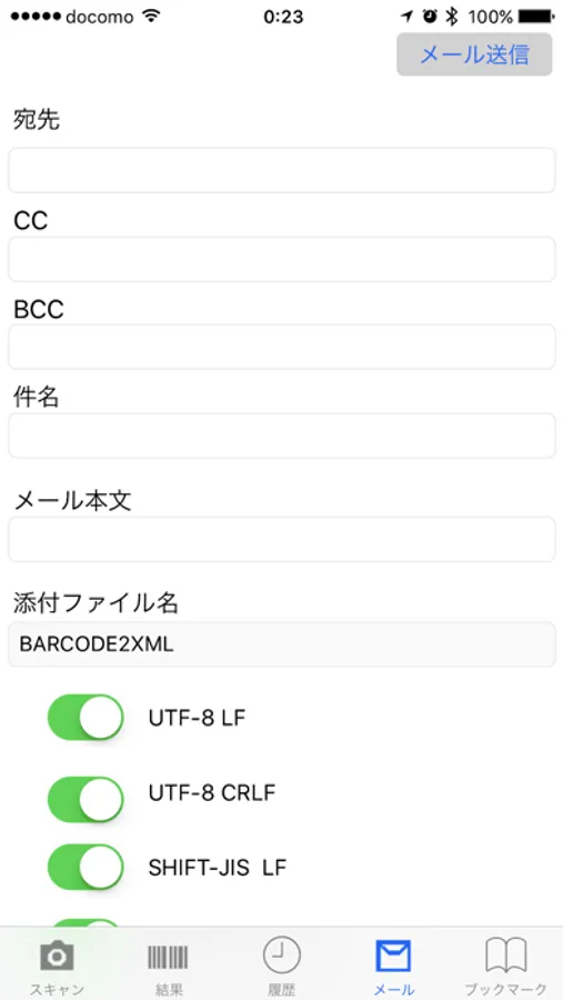 iPhone のカメラでスキャンしたBarcodeデータをXMLファイルに保存してメールに添付できます。
