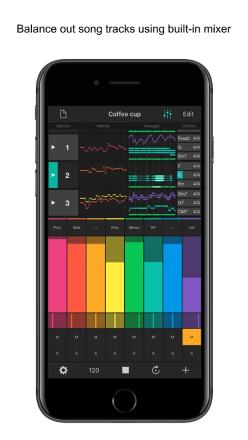 - Add up to 4 tracks to your arpeggio grid. Each track has it’s color, octave and number of parallel voices.
