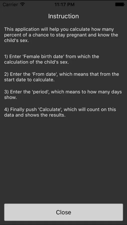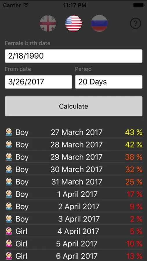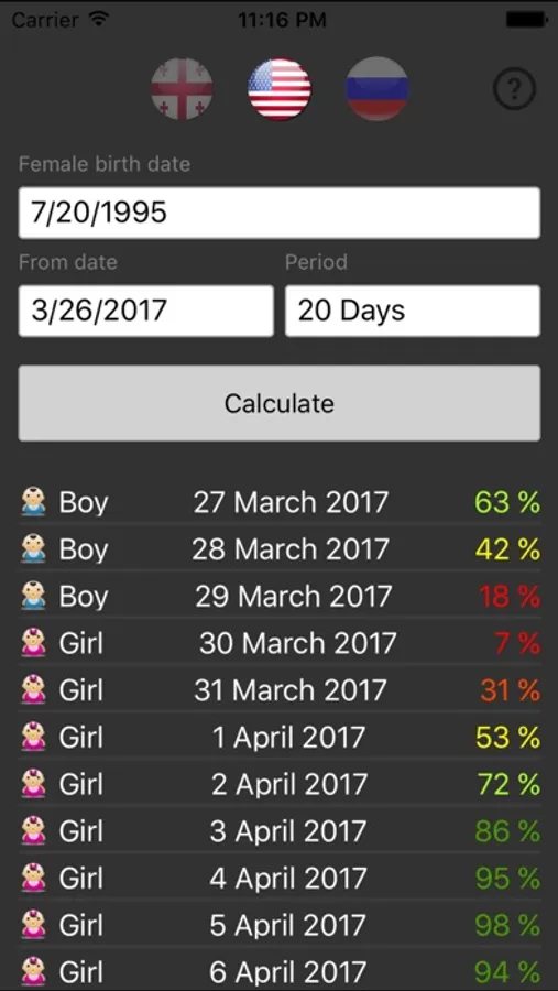This application will help you calculate how many percent of a chance to stay pregnant and know the child's sex.