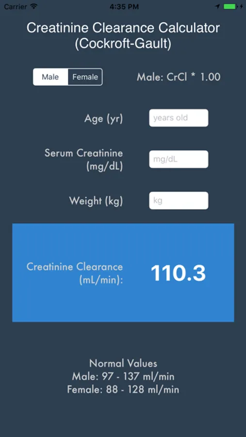 This app calculates the creatinine clearance according to the Cockroft-Gault equation. A patient's creatinine clearance is often used to dose certain medications based on the patient's kidney function.