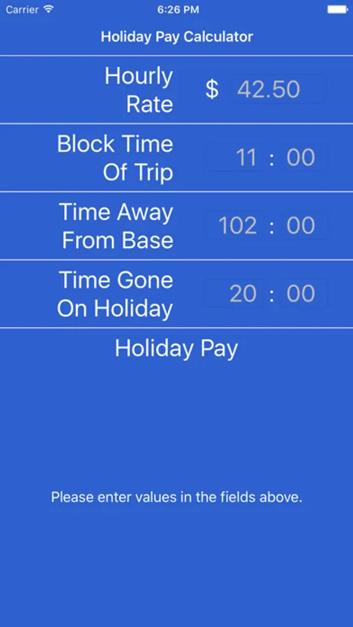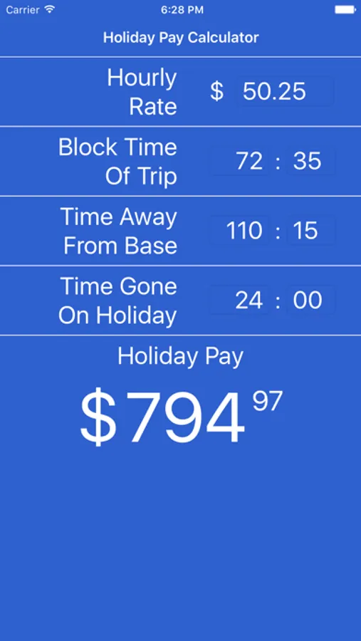 This new tool incorporates our new formula for holiday pay in a user friendly format. Simply enter four values: Hourly Pay Rate, Block Hours for the Trip, Time Away From Base for the trip, and Hours on Holiday. The app does the rest, and displays your total Holiday Pay!