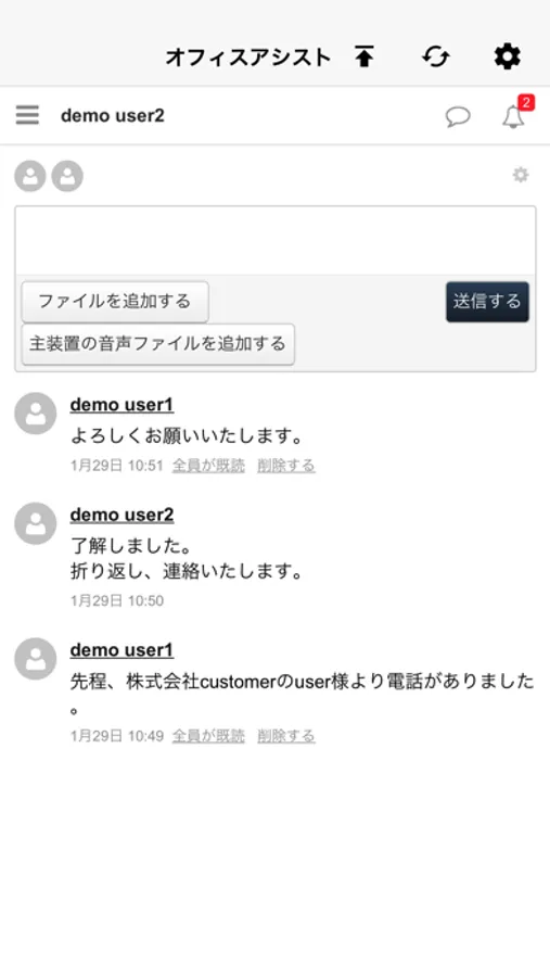 ・ユーザー同士で文字入力、ファイルや画像の添付による会話(チャット)をすることができます。
