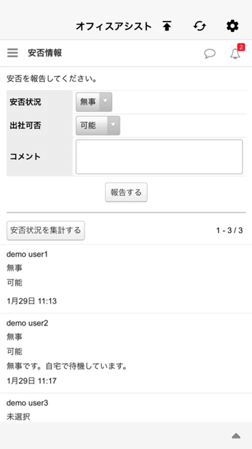 ・全ユーザーに地震速報等の同報通知を行い、安否確認や安否状況の集計をすることができます。