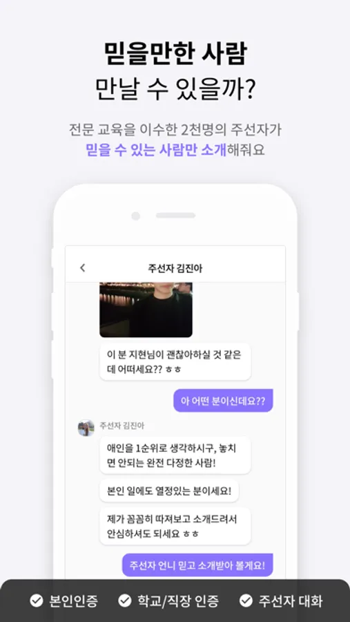 - 2주 간의 전문 교육을 이수한 프로 주선자가 인증된 회원과의 소개팅을 주선해요. (누적 프로주선자 2,000명 이상, 가입비 없음)