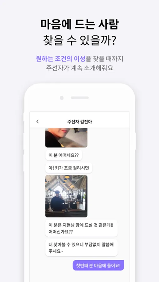 - 주선자와의 대화를 통해 외모스타일, 나이, 키, 지역, 직업, 학교 등 내 이상형에 맞는 이성을 제안 받을 수 있어요. (대화 100% 무료)