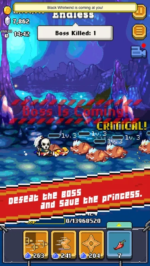 The Demon Lord kidnapped the princess. It is up to our protagonist, a rusty blade in hand, to rescue her. Players control the protagonist to clear stages, challenge bosses and rescue the princess.