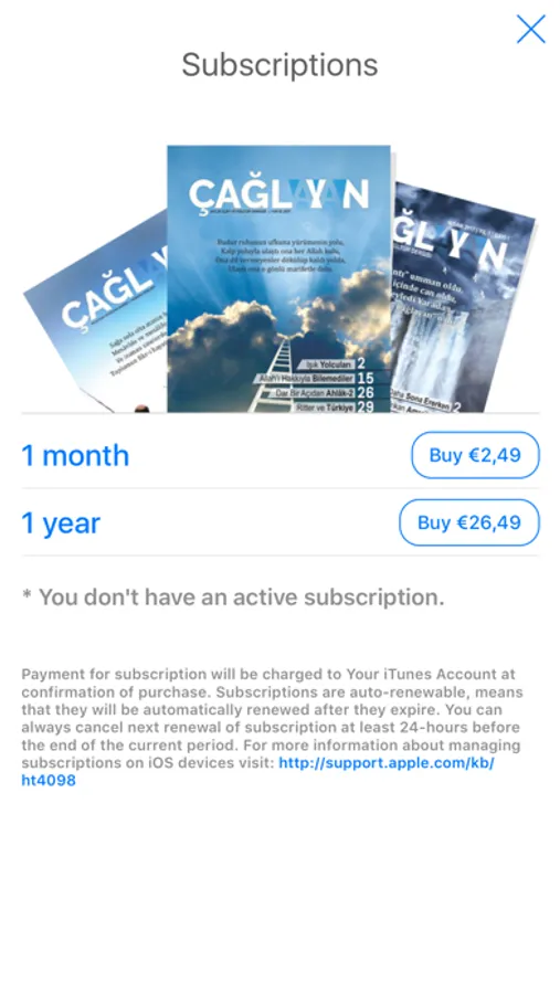 Abonelik için yapılan ödeme, satın alma işleminin onaylanması durumunda iTunes Hesap ücretinden karşılanacaktır. Abonelikler otomatik yenilenebilir, bu süre dolduktan sonra otomatik olarak yenilenirler. Bir sonraki aboneliği yenilemeyi, cari dönemin bitişinden en az 24 saat önce her zaman iptal edebilirsiniz. Abonelikler kullanıcı tarafından yönetilebilir ve satın alma işleminden sonra kullanıcının Hesap Ayarlarına giderek otomatik yenileme kapatılabilir.