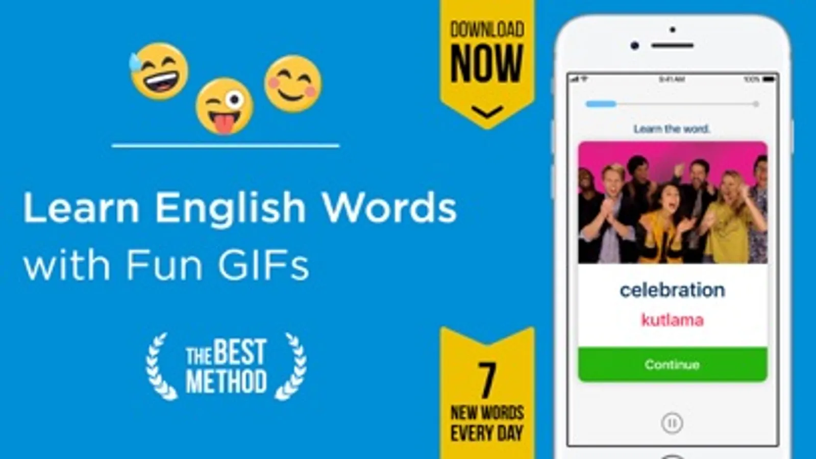 Learn 7 new English words every day with fun GIFs. All words you need to say "Yes! I can speak English." is included. We know you fed up with boring and useless English learning apps. Learn new English words with Hello7 while having fun. Download and give it a try. You will love it!
