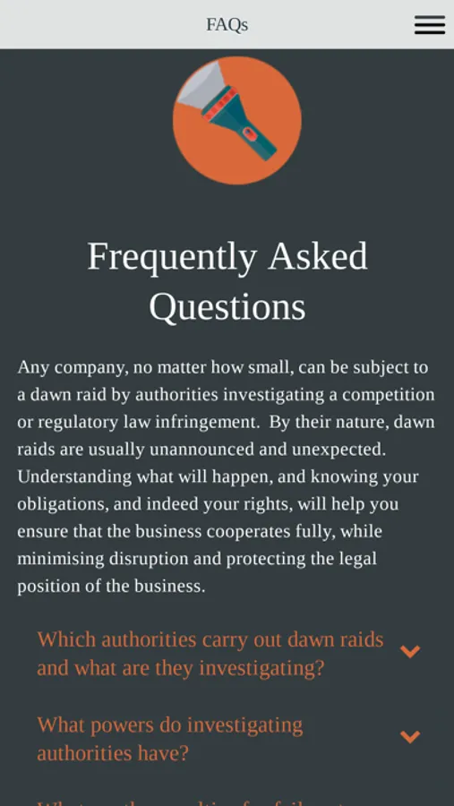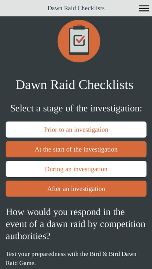 The Bird & Bird Dawn Raid app is designed to give you key information for before, during and after a dawn raid. It covers your obligations and rights, allowing you to minimise disruption and protect your business. The app also features frequently asked questions and emergency Bird & Bird contacts to provide clients with support at their fingertips.