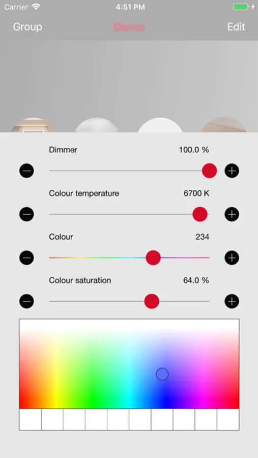 - On/off switching and dimming of RGB lights, setting of light colour.