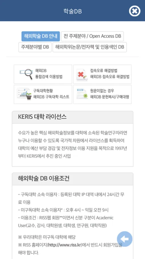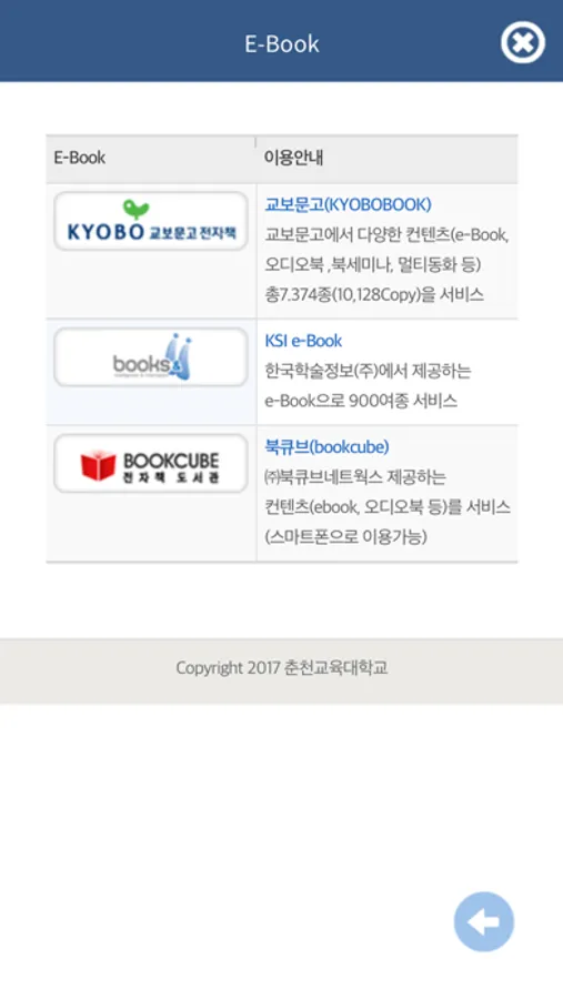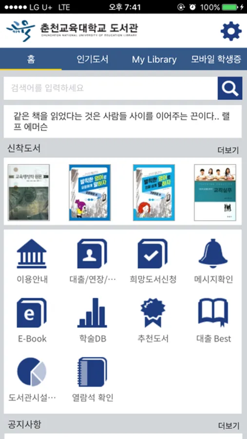춘천교육대학교 도서관은 모바일 앱(APP)을 개발함으로써 iOS를 통한 서비스를 제공하게 되었습니다. 앱(App)을 통해 도서관소개, 이용안내, 통합검색, 대출조회 및 연기신청, 예약 등 도서관에서 제공되는 모든 서비스를 동일하게 이용할 수 있습니다.